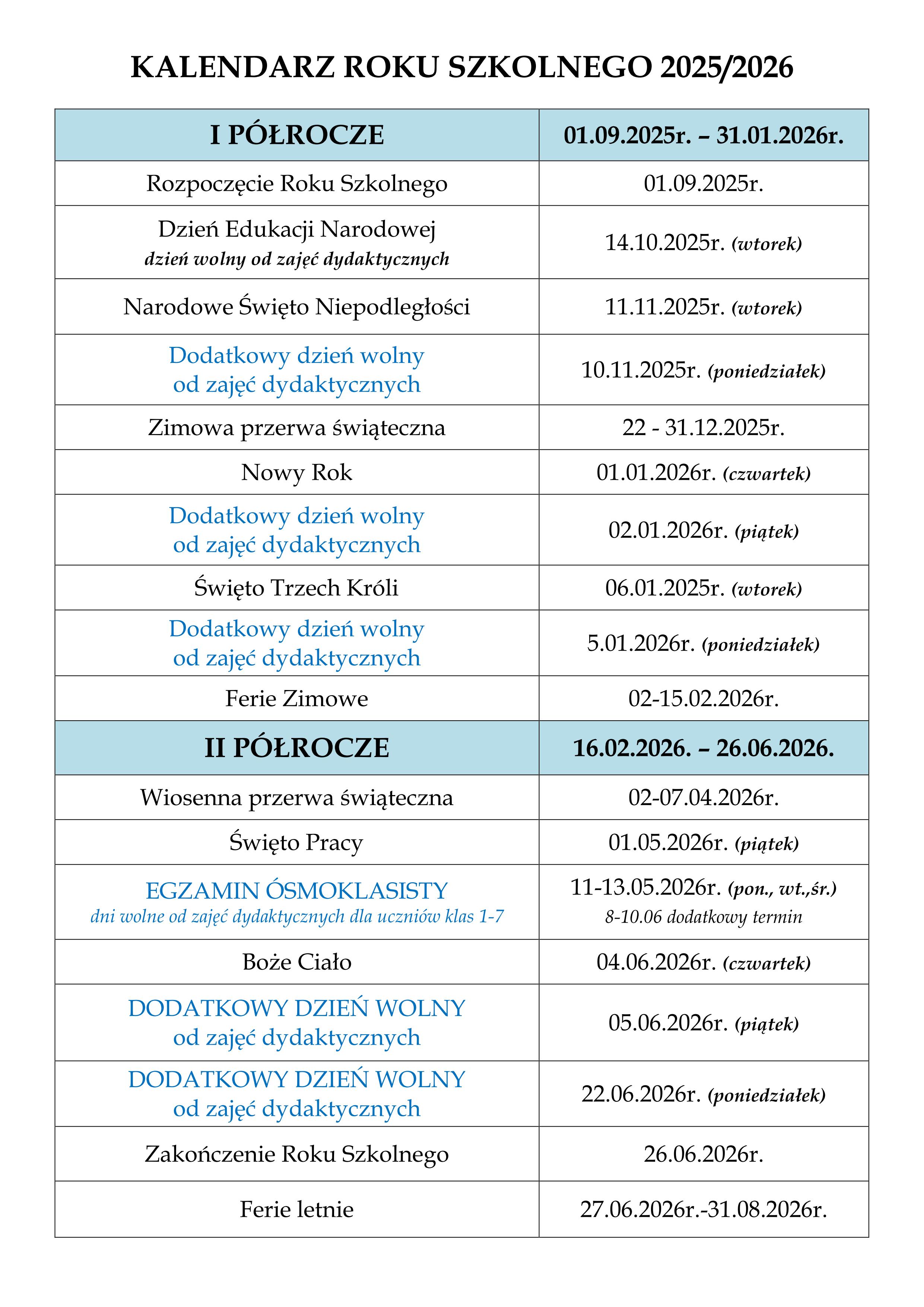 KALENDARZ ROKU SZKOLNEGO 2025/2026
